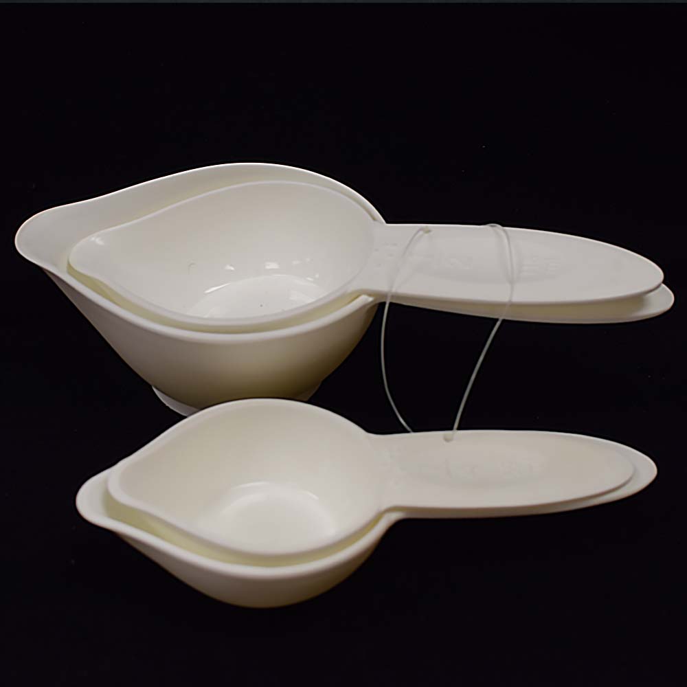 Plastic measuring cups labeled in print and Braille and include a metric measurement in print.